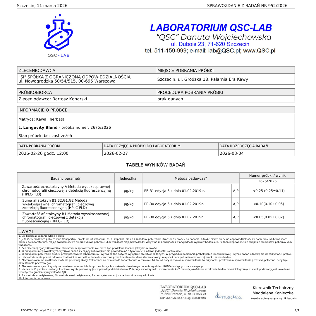 Nasza kawa została przebadana w niezależnym laboratorium pod kątem najważniejszych mykotoksyn kawowych: